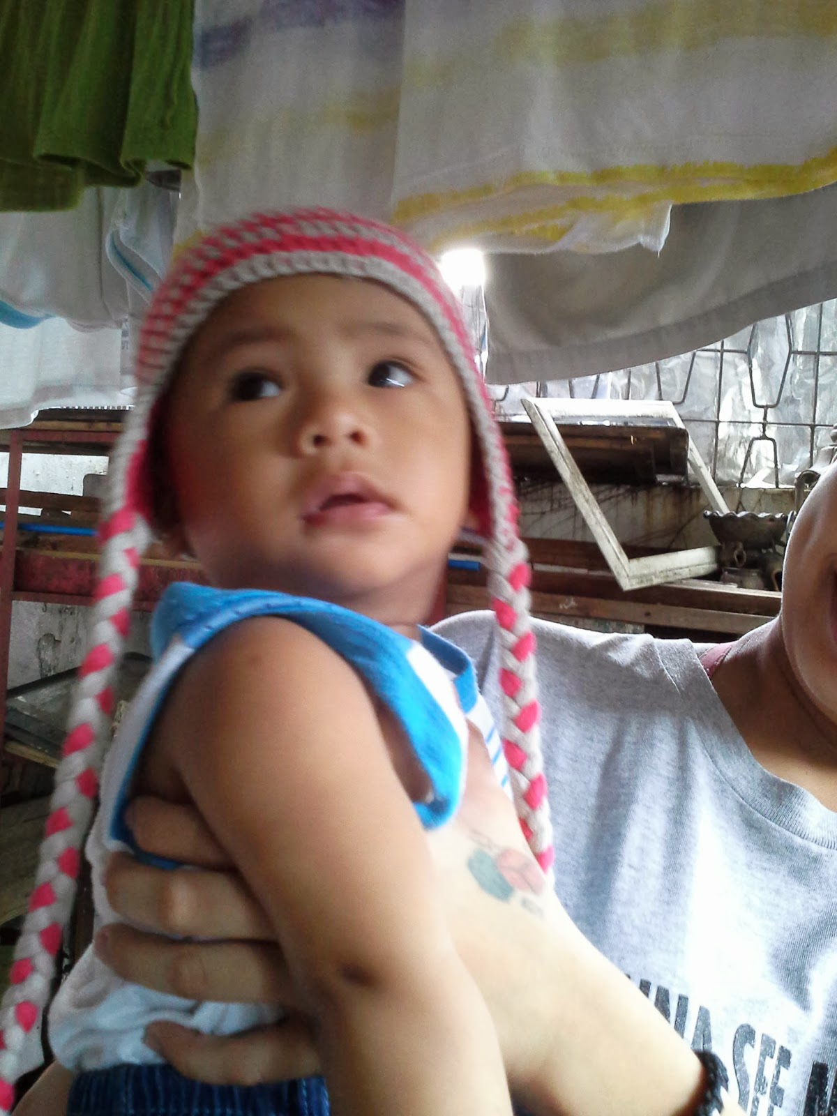 I'm uploading images of my latest finished project - a baby hat with earflaps for my grandson.